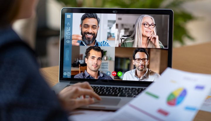 in video conference. Multiethnic business team using laptop for a online